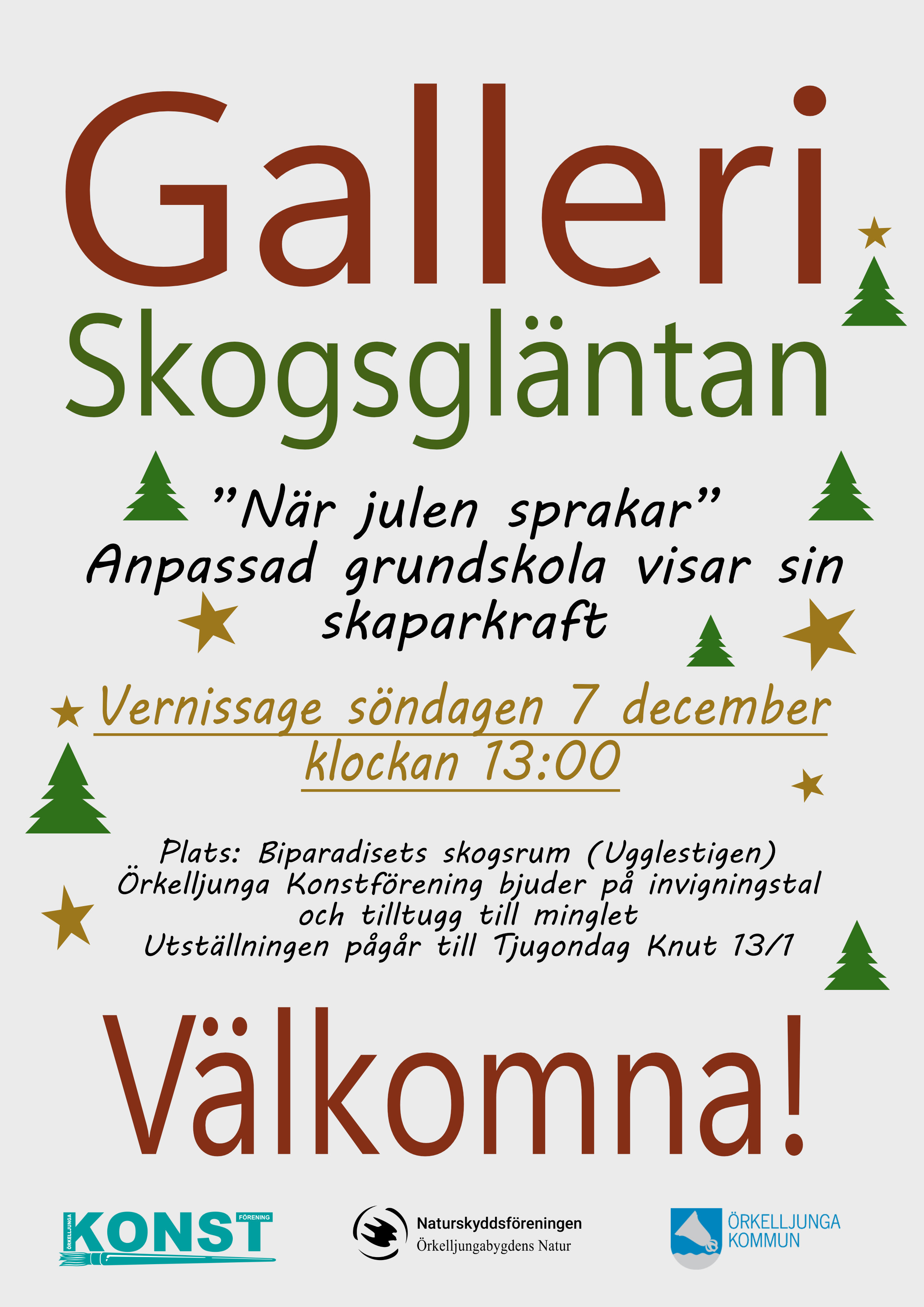 Örkelljunga Konstförening bjuder på invigningstal och tilltugg till minglet. Utställningen pågår över hela jul- och nyårshelgen och avslutas Tjugondag Knut den 13 januari.